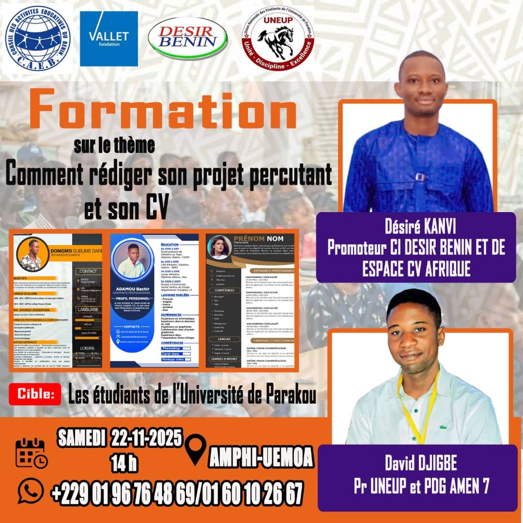 Cette formation est pour demain samedi 22/11/2025 et est pour les étudiants de l'Université de PARAKOU.